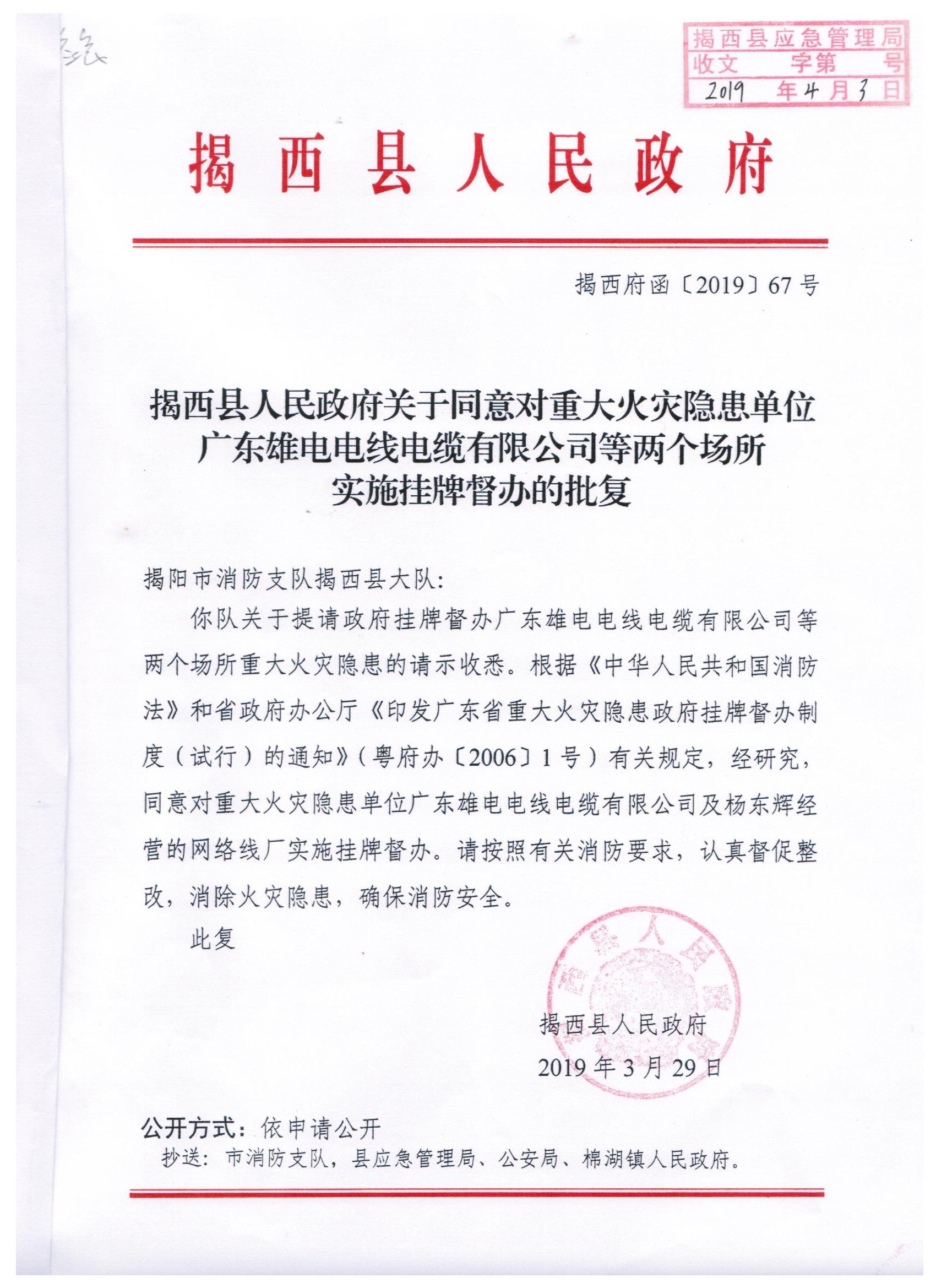 揭西縣關(guān)于同意對重大火災(zāi)隱患廣東雄電電線電纜有限公司等兩個場所實(shí)施掛牌督辦的批復(fù)