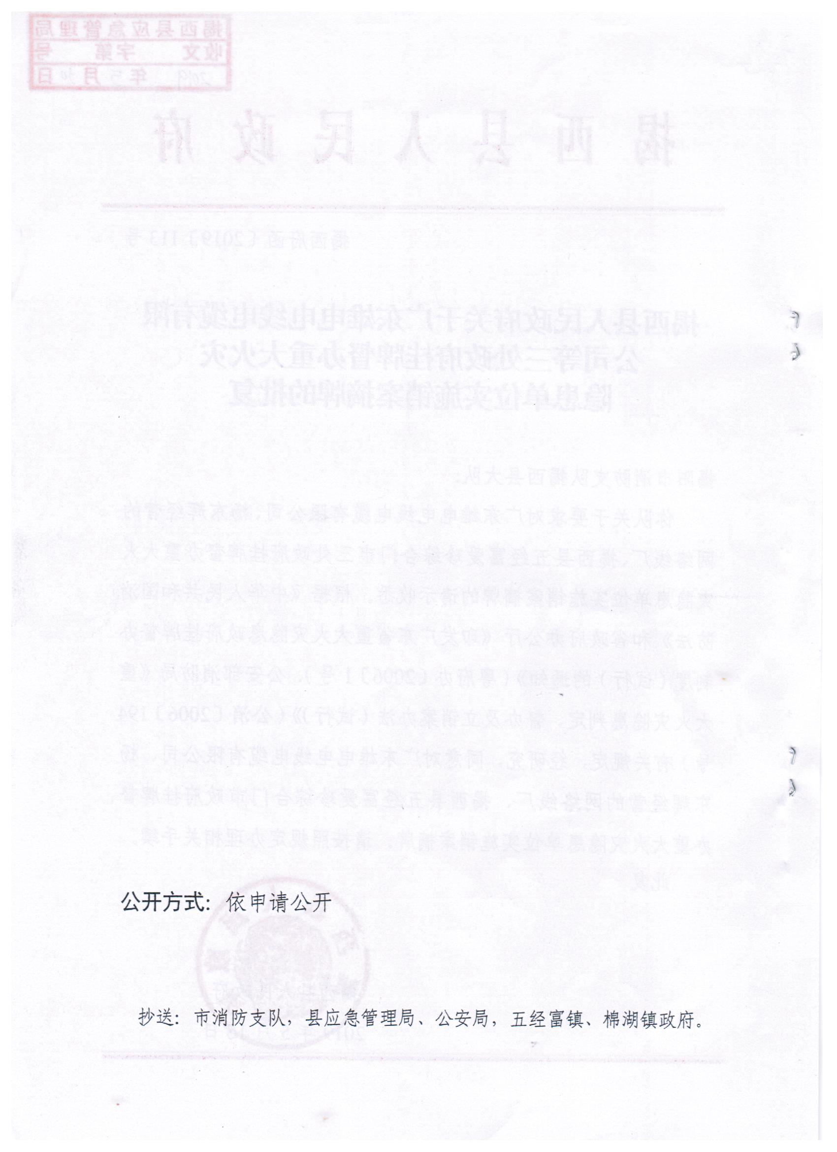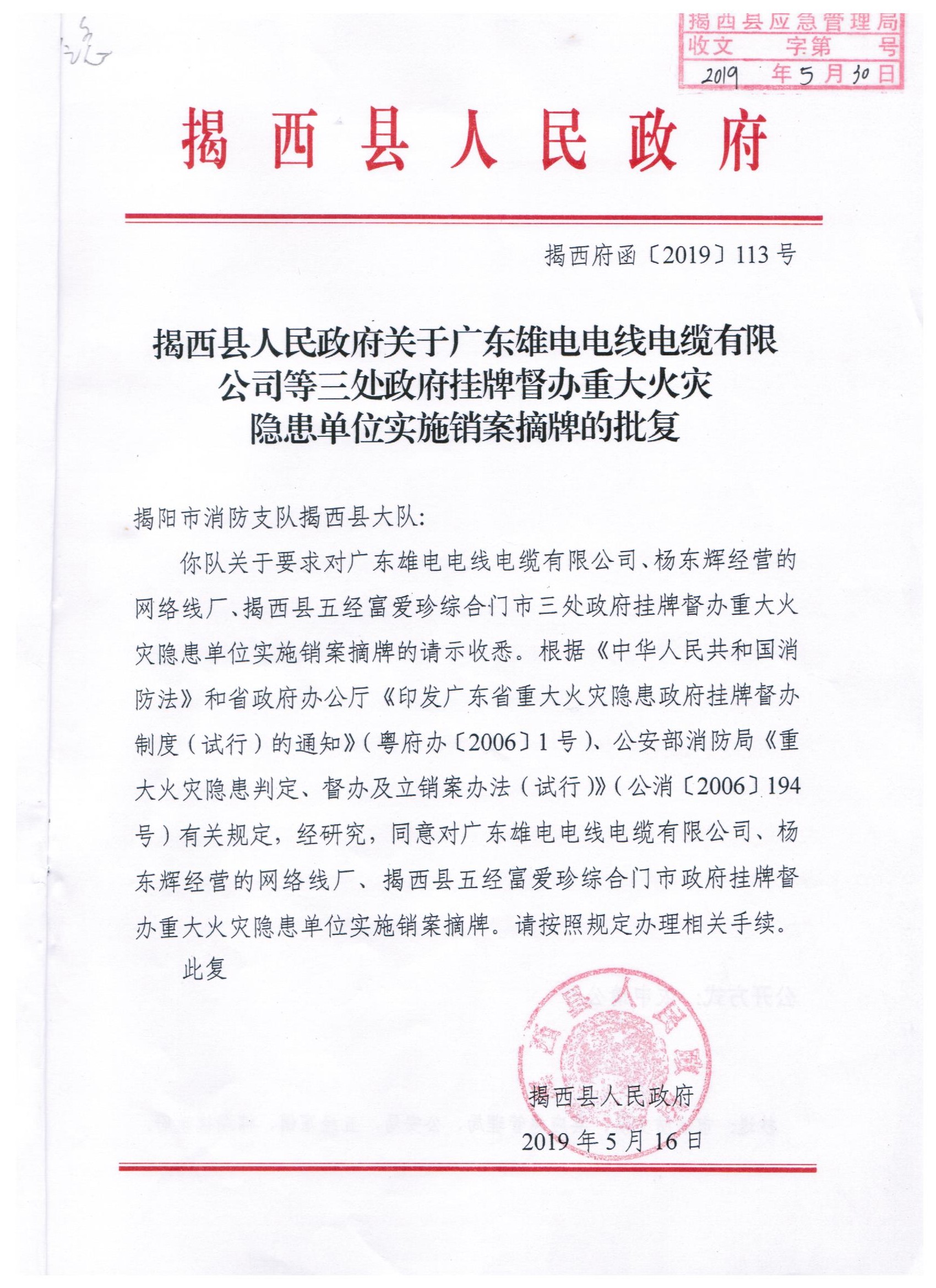 揭西縣人民政府關于廣東雄電電線電纜有限公司等三處政府掛牌督辦重大火災隱患單位實施銷案摘牌的批復