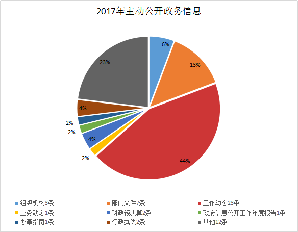 我們積極拓寬信息公開范圍,創新方法方式,主動公開信息。主要通過揭西縣人民政府門戶網站、開設政務公開欄等形式,主動公開統計職能、統計工作動態等。目前,我局信息公開工作運行正常,2017年度我局公布各類信息51條,其中:組織機構3條,部門文件7條,工作動態23條,業務動態1條,政府信息公開工作年度報告1條,其他信息12條,財政預決算2條,辦事指南1條,行政執法1條。
